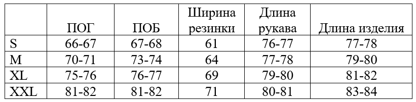 *обратите внимание, что в таблице указаны полуобхваты, значения указаны в сантиметрах, длина изделия по полочке (от основания шеи, через грудь), длина рукава - от основания шеи, через плечо.