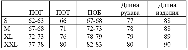 *обратите внимание, что в таблице указаны полуобхваты, значения указаны в сантиметрах, длина изделия по полочке (от основания шеи, через грудь), длина рукава - от основания шеи, через плечо.