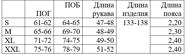 *обратите внимание, что в таблице указаны полуобхваты, значения указаны в сантиметрах, длина изделия по полочке (от основания шеи, через грудь), длина рукава - от основания шеи, через плечо. Значения указаны без учета растяжения ткани.