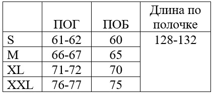 *обратите внимание, что в таблице указаны полуобхваты, значения указаны в сантиметрах, длина изделия по полочке (от основания шеи, через грудь), длина рукава - от основания шеи, через плечо.