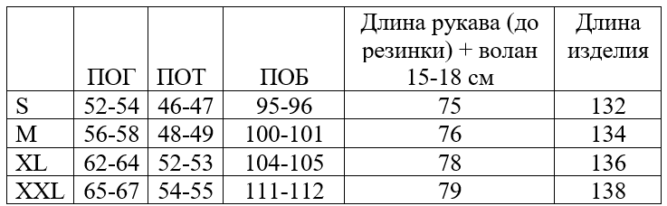 *обратите внимание, что в таблице указаны полуобхваты, значения указаны в сантиметрах, длина изделия по полочке (от основания шеи, через грудь), длина рукава - от основания шеи, через плечо.
