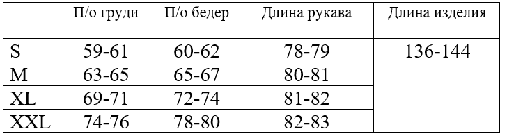 *обратите внимание, что в таблице указаны полуобхваты, значения указаны в сантиметрах, длина изделия по полочке (от основания шеи, через грудь), длина рукава - от основания шеи, через плечо.