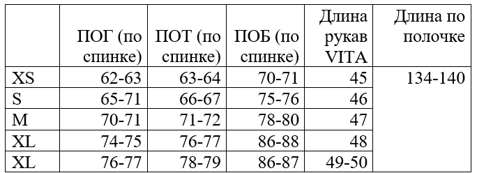 *обратите внимание, что в таблице указаны полуобхваты, значения указаны в сантиметрах, длина изделия по полочке (от основания шеи, через грудь), длина рукава - от основания шеи, через плечо.
