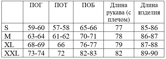 *обратите внимание, что в таблице указаны полуобхваты, значения указаны в сантиметрах, длина изделия по полочке (от основания шеи, через грудь), длина рукава - от основания шеи, через плечо.