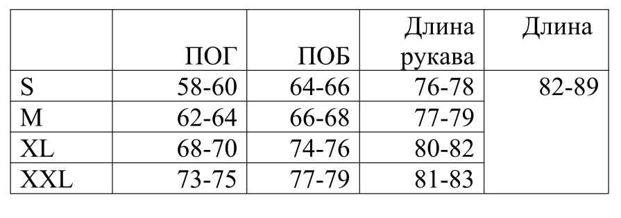 *обратите внимание, что в таблице указаны полуобхваты, значения указаны в сантиметрах, длина изделия по полочке (от основания шеи, через грудь), длина рукава - от основания шеи, через плечо.