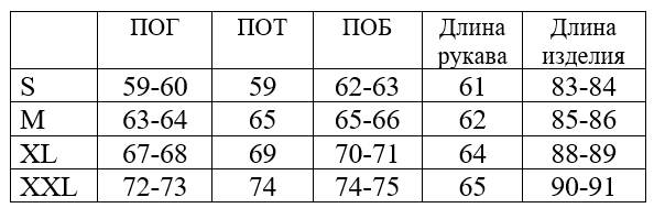 *обратите внимание, что в таблице указаны полуобхваты, значения указаны в сантиметрах, длина изделия по полочке (от основания шеи, через грудь), длина рукава - от основания шеи, через плечо.