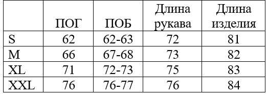 *обратите внимание, что в таблице указаны полуобхваты, значения указаны в сантиметрах, длина изделия по полочке (от основания шеи, через грудь), длина рукава - от основания шеи, через плечо.