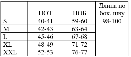 *обратите внимание, что в таблице указаны полуобхваты, значения указаны в сантиметрах, длина изделия по боковому шву от талии (самой узкой части). Полуобхват по талии указан без учета растяжения резинки.