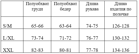 *обратите внимание, что в таблице указаны полуобхваты, значения указаны в сантиметрах, длина изделия по полочке (от основания шеи, через грудь), длина рукава - от основания шеи, через плечо.