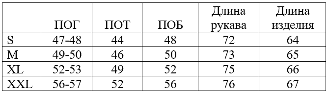 *обратите внимание, что в таблице указаны полуобхваты, значения указаны в сантиметрах, длина изделия по полочке (от основания шеи, через грудь), длина рукава - от основания шеи, через плечо. Значения указаны без учета растяжения ткани.