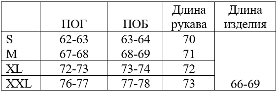 *обратите внимание, что в таблице указаны полуобхваты, значения указаны в сантиметрах, длина изделия по полочке (от основания шеи, через грудь), длина рукава - от основания шеи, через плечо.