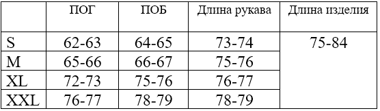 *обратите внимание, что в таблице указаны полуобхваты, значения указаны в сантиметрах, длина изделия по полочке (от основания шеи, через грудь), длина рукава - от основания шеи, через плечо.