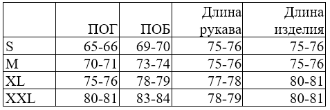 *обратите внимание, что в таблице указаны полуобхваты, значения указаны в сантиметрах, длина изделия по полочке (от основания шеи, через грудь), длина рукава - от основания шеи, через плечо.