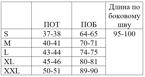 *обратите внимание, что в таблице указаны полуобхваты, значения указаны в сантиметрах, длина изделия по боковому шву от талии (самой узкой части). Полуобхват талии указан без учета растяжения резинки.
