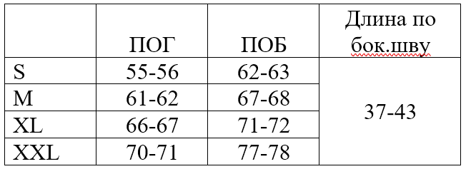 *обратите внимание, что в таблице указаны полуобхваты, значения указаны в сантиметрах, длина изделия по полочке (от основания шеи, через грудь).