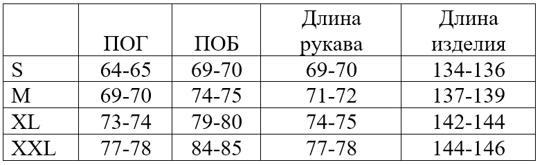 *обратите внимание, что в таблице указаны полуобхваты, значения указаны в сантиметрах, длина изделия по полочке (от основания шеи, через грудь), длина рукава - от основания шеи, через плечо.