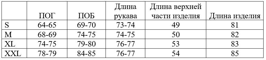 *обратите внимание, что в таблице указаны полуобхваты, значения указаны в сантиметрах, длина изделия по полочке (от основания шеи, через грудь), длина рукава - от основания шеи, через плечо.
