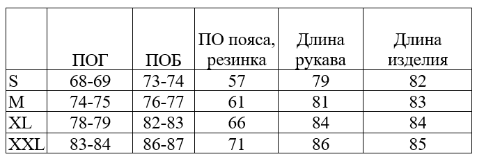 *обратите внимание, что в таблице указаны полуобхваты, значения указаны в сантиметрах, длина изделия по полочке (от основания шеи, через грудь), длина рукава - от основания шеи, через плечо.