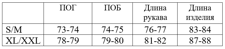 *обратите внимание, что в таблице указаны полуобхваты, значения указаны в сантиметрах, длина изделия по полочке (от основания шеи, через грудь), длина рукава - от основания шеи, через плечо.