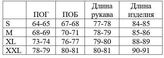 *обратите внимание, что в таблице указаны полуобхваты, значения указаны в сантиметрах, длина изделия по полочке (от основания шеи, через грудь), длина рукава - от основания шеи, через плечо.