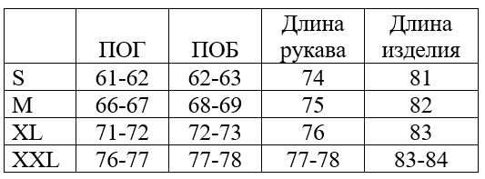 *обратите внимание, что в таблице указаны полуобхваты, значения указаны в сантиметрах, длина изделия по полочке (от основания шеи, через грудь), длина рукава - от основания шеи, через плечо.