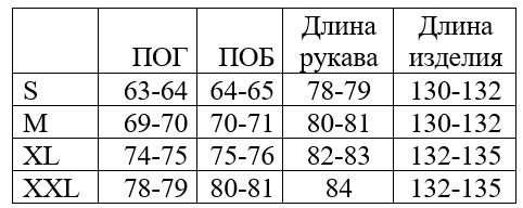 *обратите внимание, что в таблице указаны полуобхваты, значения указаны в сантиметрах, длина изделия по полочке (от основания шеи, через грудь), длина рукава - от основания шеи, через плечо.