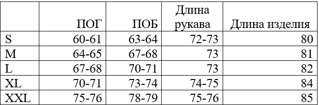 *обратите внимание, что в таблице указаны полуобхваты, значения указаны в сантиметрах, длина изделия по полочке (от основания шеи, через грудь), длина рукава - от основания шеи, через плечо.