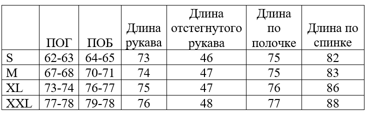 *обратите внимание, что в таблице указаны полуобхваты, значения указаны в сантиметрах, длина изделия по полочке (от основания шеи, через грудь), длина рукава - от основания шеи, через плечо.