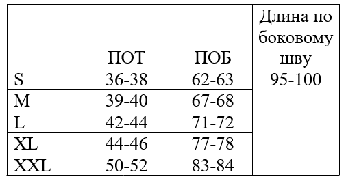 *обратите внимание, что в таблице указаны полуобхваты, значения указаны в сантиметрах, длина изделия по боковому шву от талии (самой узкой части). Полуобхват талии указан без учета растяжения резинки.