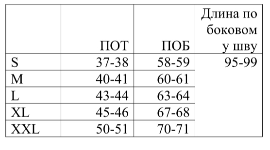 *обратите внимание, что в таблице указаны полуобхваты, значения указаны в сантиметрах, длина изделия по боковому шву от талии (самой узкой части). Полуобхват талии указан без учета растяжения резинки.