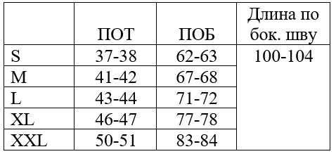 *обратите внимание, что в таблице указаны полуобхваты, значения указаны в сантиметрах, длина изделия по боковому шву от талии (самой узкой части). Полуобхват талии указан без учета растяжения резинки.