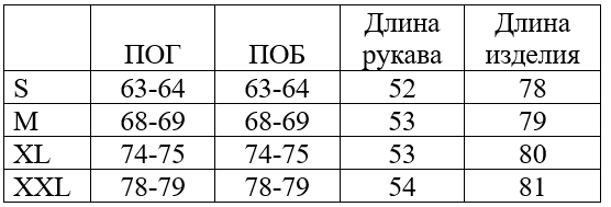*обратите внимание, что в таблице указаны полуобхваты, значения указаны в сантиметрах, длина изделия по полочке (от основания шеи, через грудь), длина рукава - от основания шеи, через плечо.