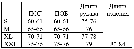 *обратите внимание, что в таблице указаны полуобхваты, значения указаны в сантиметрах, длина изделия по полочке (от основания шеи, через грудь), длина рукава - от основания шеи, через плечо.