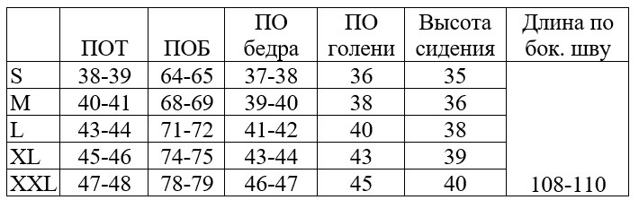 *обратите внимание, что в таблице указаны полуобхваты, значения указаны в сантиметрах, длина изделия по боковому шву от талии (самой узкой части). Полуобхват по талии указан без учета растяжении резинки.