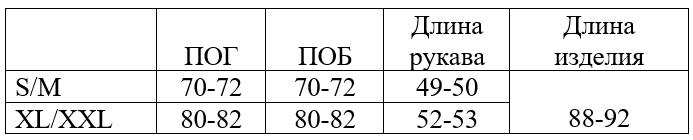 *обратите внимание, что в таблице указаны полуобхваты, значения указаны в сантиметрах, длина изделия по полочке (от основания шеи, через грудь), длина рукава - от основания шеи, через плечо.