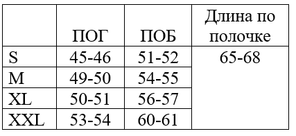 *обратите внимание, что в таблице указаны полуобхваты, значения указаны в сантиметрах, длина изделия по полочке (от основания шеи, через грудь), длина рукава - от основания шеи, через плечо.