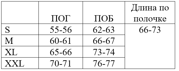 *обратите внимание, что в таблице указаны полуобхваты, значения указаны в сантиметрах, длина изделия по полочке (от основания шеи, через грудь), длина рукава - от основания шеи, через плечо.