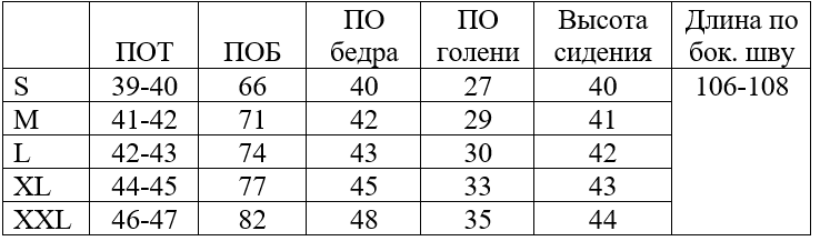 *обратите внимание, что в таблице указаны полуобхваты, значения указаны в сантиметрах, длина изделия по боковому шву от талии (самой узкой части). Полуобхват по талии указан без учета растяжении резинки.