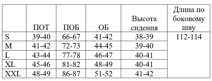 *обратите внимание, что в таблице указаны полуобхваты, значения указаны в сантиметрах, длина изделия по боковому шву от талии (самой узкой части). Полуобхват по талии указан без учета растяжении резинки.