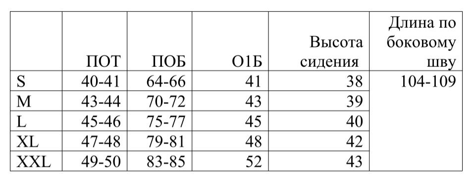 *обратите внимание, что в таблице указаны полуобхваты, значения указаны в сантиметрах, длина изделия по боковому шву от талии (самой узкой части). Полуобхват талии указан без учета растяжения резинки.